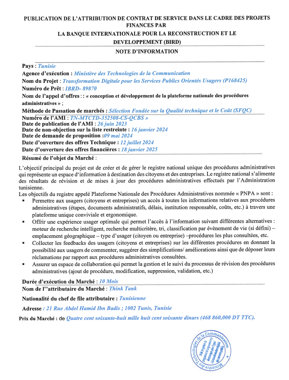 14 mars 2025Tout juste sorti de presse : Dans le cadre de l’exécution du Programme de Transformation digitale pour des services publics orientés citoyens « GovTech », le Ministère des Technologies de la Communication vient de rendre public l’avis de publication des Résultats d’attribution de contrat de services relatif à la « Conception et développement de la Plateforme Nationale des Procédures Administratives – PNPA« , et ce dans le cadre des projets financés par la Banque Internationale pour la Reconstruction et le Développement (BIRD) qui relève du Groupe Banque Mondiale, et en occurrence son projet « Govtech ».