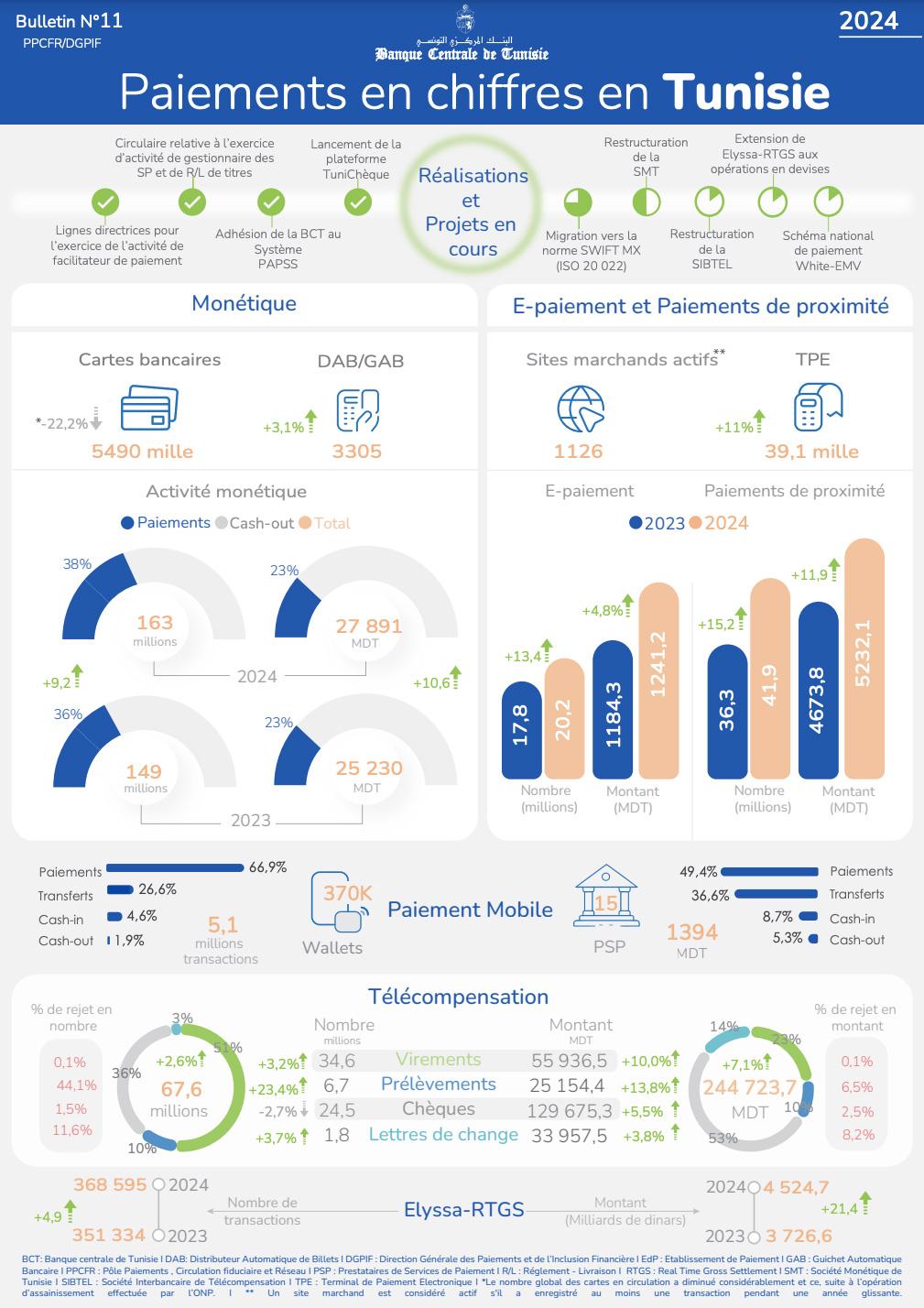 1 mars 2025Sur fond de passage vers la nouvelle plateforme Tunichèque et ses premiers impacts palpables, la Banque Centrale de Tunisie « BCT » vient de communiquer son dernier bulletin sur les paiements en chiffres en Tunisie pour l’année 2024.